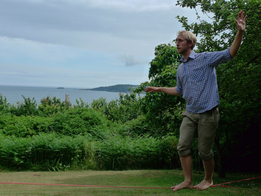 Now walk! Practicing his balance. Lukas slacklining at the cabin.